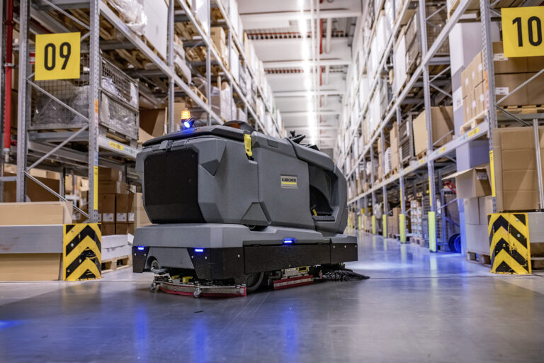 Der KIRA B 50 kann manuell gefahren werden oder – mit optionaler Dockingstation – vollautonom arbeiten. In der Dockingstation lädt sich das Gerät auf, füllt Frischwasser nach, lässt Schmutzwasser ab und spült sich selbst.